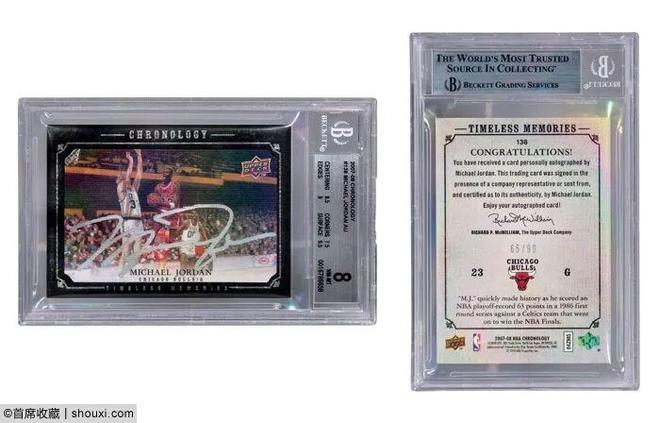 2007-08迈克尔-乔丹亲笔签字球星卡65/99,BGS8,估价5万-35万元;2005-06迈克尔-乔丹亲笔签字球星卡03/13,BGS9.5/10,估价6万-40万元;2024-25安东尼-爱德华兹球衣PATCH实物签字球星卡1/1,估价10万-80万元。